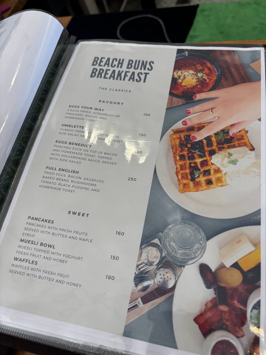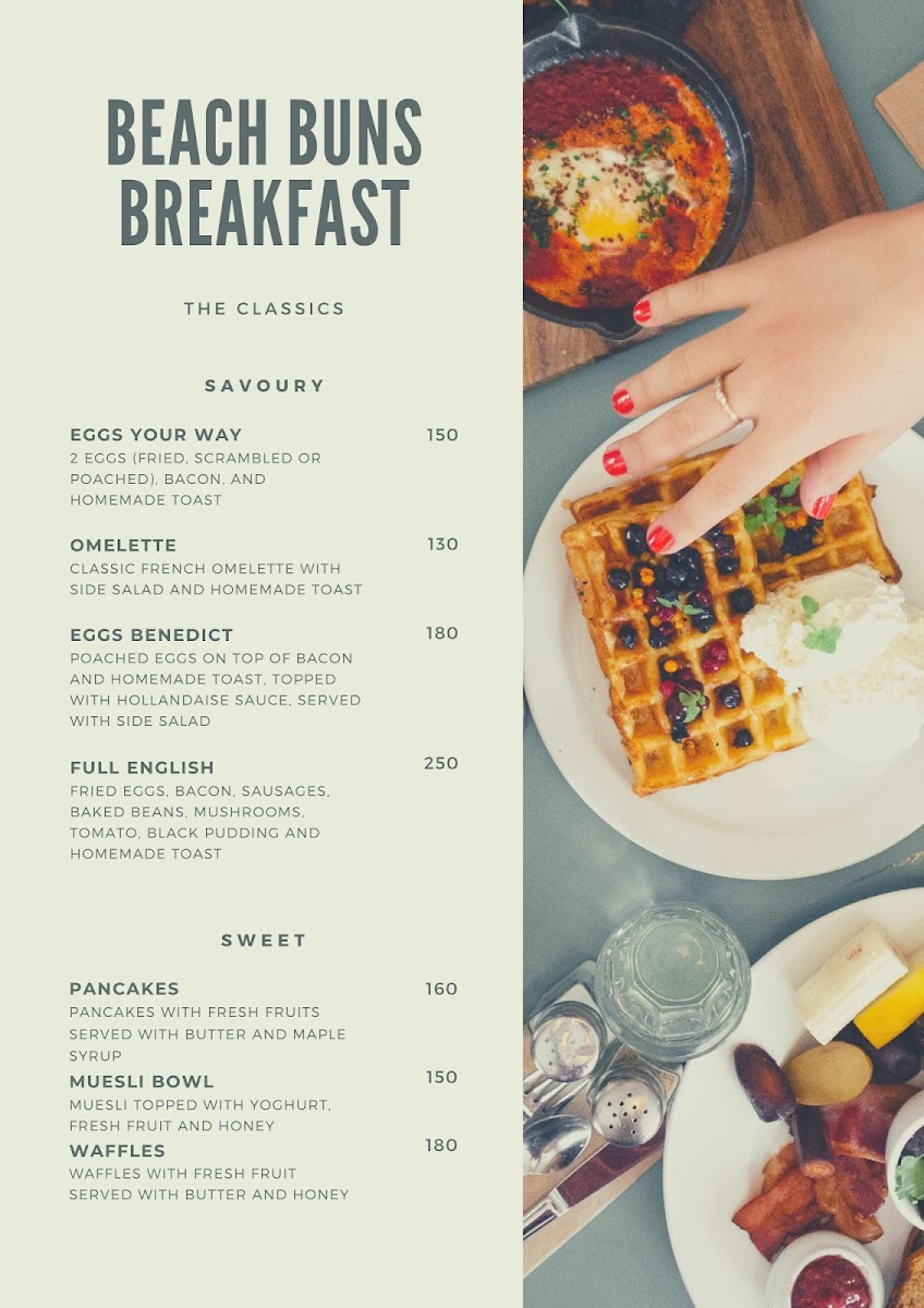 The menu at Beach Buns Cafe & Bakery focuses primarily on breakfast and light meal options suitable for casual dining or coffee breaks. Visitors can expect a selection of cafe-style foods and bakery items accompanied by a variety of beverages.